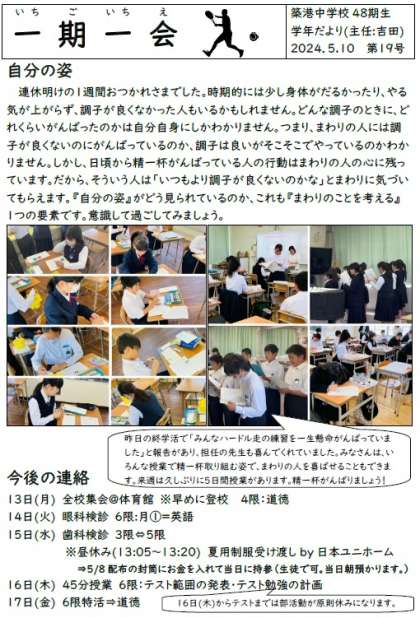 1年生学年通信一期一会第19号は、自分のことを他人の目から見てみる、です。