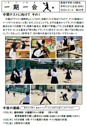 1年生学年通信一期一会第20号は、1年生にとっての初めての定期テストに向けての準備の基本です。しっかり準備して、実力を発揮してほしいです。