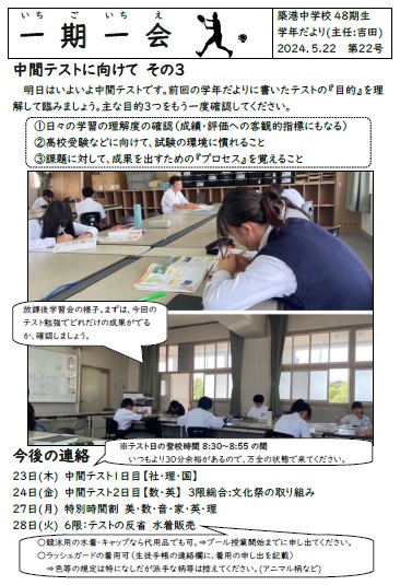 1年生学年通信一期一会第22号は、いよいよ始まる中間テストにむけて、頑張っている様子です。