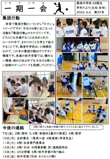 1年生学年通信一期一会第29号は、チームビルドの様子です。