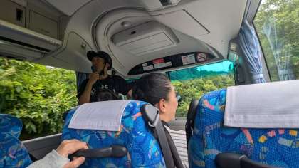 バス移動中にラフティング講師から川や鮎についての説明を聞きながら移動しています。