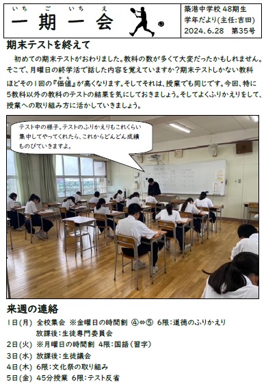 1年生学年通信一期一会第35号は、期末テスト2日目終了です。