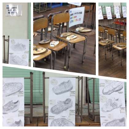 靴のデッサンと「いのち」をテーマにプッシュステンドの作品、一泊移住のスライスチップの作品です。