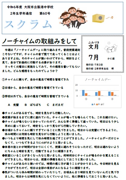2年生学年通信スクラム第60号は、昨日のノーチャイムデーについての感想です。
