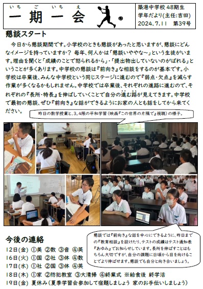 1年生学年通信一期一会第39号