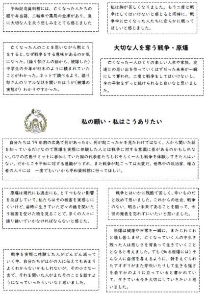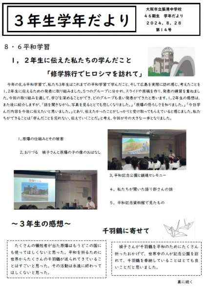 3年生学年だより第14号は、平和登校日の感想です。修学旅行で学んだことを1・2年生に伝えました。