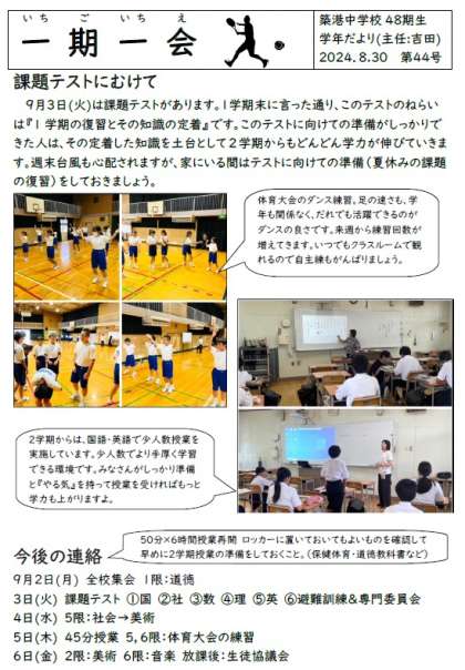 1年生学年通信一期一会第44号は明日の課題テストについてです。