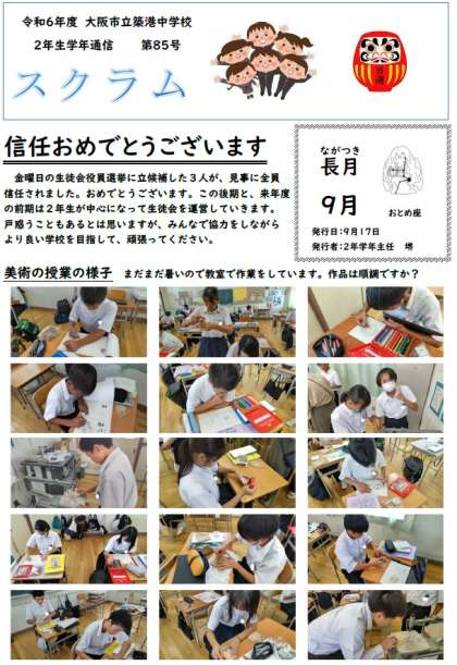 2年生学年通信スクラム第85号は美術の時間のようすです。信任された生徒会のみなさん、よろしくおねがいしますね。
