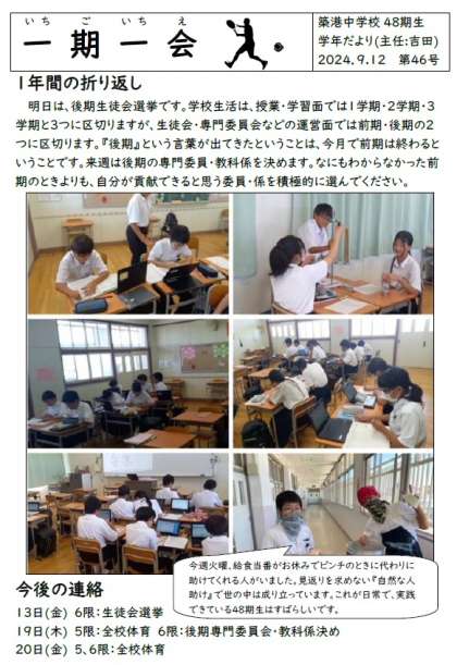 1年生学年通信一期一会第46号は、後期に向けて、です。