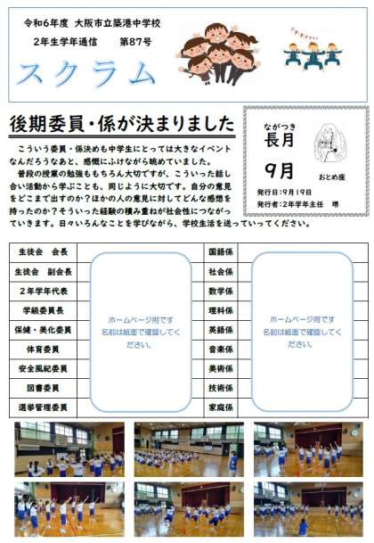 2年生学年通信スクラム第87号は、後期役員・委員の決定と、体育大会の練習の様子です。