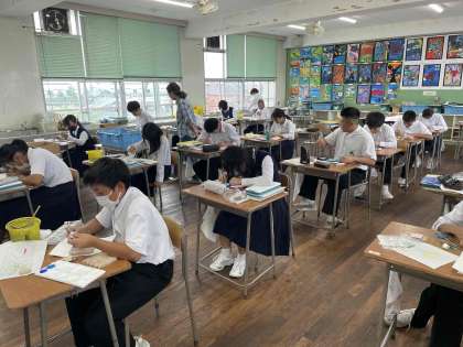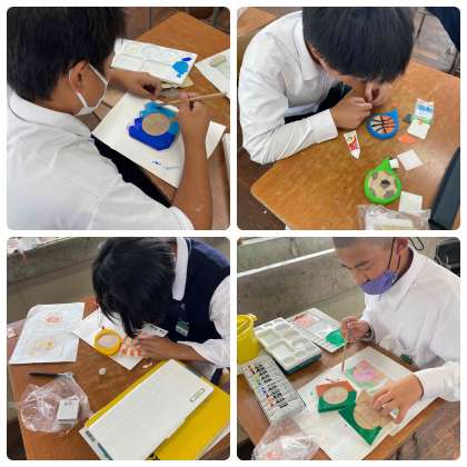 絵の具で色をつけたら、プラスチックを割って貼っていきます。完成が楽しみです!