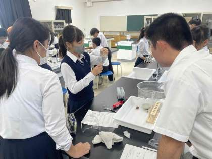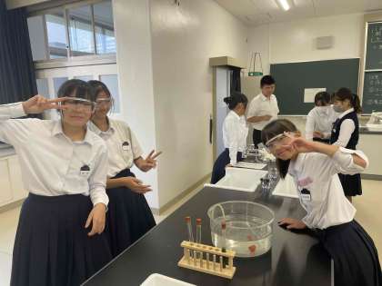 複数人で協力して実験を行い、気体を調べることができました。保護メガネも似合っています!