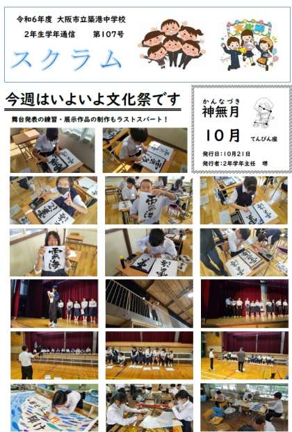 2年生学年通信スクラム第107号は、授業の様子と、文化祭の取り組みです。