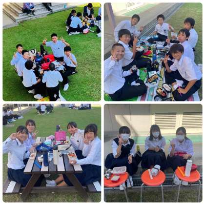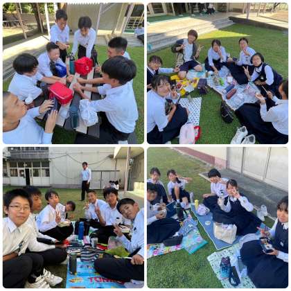 1.2年生は合同で芝生で食べました。