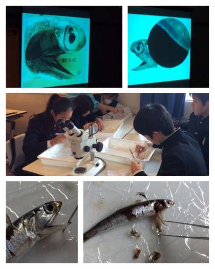 講義の後、実際に一人一尾ずつカタクチイワシの解剖実習を行い鰓耙(さいは)を取り出して確認することができました。自分の目で確認し取り出したことで、とても分かりやすく説得力のある課外授業です。