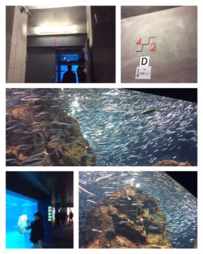 解剖実習の後は、レクチャールームから5F・6Fへ普段通ることのない秘密の階段?で登ります。生徒たちはワクワク感と緊張感がみなぎっています。非常扉から館内に入ると水族館の大きな水槽が現れました。