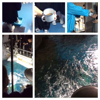 2班に分かれて、カタクチイワシの生態観察です。1班は5Fではカタクチイワシがどのようにプランクトンを食べるのかを観察します。2班はバックヤードの6Fに上がって、シューズの裏を消毒し、エサを係員の方にもらって水槽の真上から給餌体験です。生徒の動きを察知したカタクチイワシがスピードを上げて泳ぎまわったり、口をあけている様子などしっかり観察できました。感動の一瞬です。