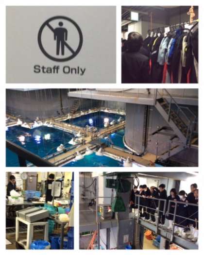 バックヤードの見学が続きます。8Fへ上がるとStaffOnlyの扉の中には、飼育員さんのウェットスーツがあったり、給餌場で作業をされているスタッフの方々もおられました。エサの製造過程では金属探知機を使っているという説明もありました。