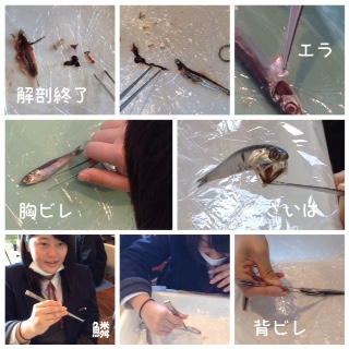 その後行われたカタクチイワシの解剖実習では、生の魚を前にはじめは遠慮がちに触れていた生徒も、観察するにつれて積極的に部位の観察を行うなど大変盛り上がりました。また観察後は勝手に内臓を取り出し、イワシを三枚におろすなど家庭科実習さながらのパフォーマンスをする子たちも現れて、さすが3年生!と思わされる場面もありました。