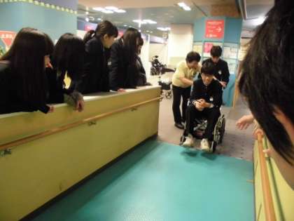 車イスの補助を楽にする電動アシストの体験をしました。普通に補助をするよりもとても簡単にできたので、驚きの声があがっていました。おもわず手を離しても、センサーが察知して自動で止まる仕組みにもびっくりです。