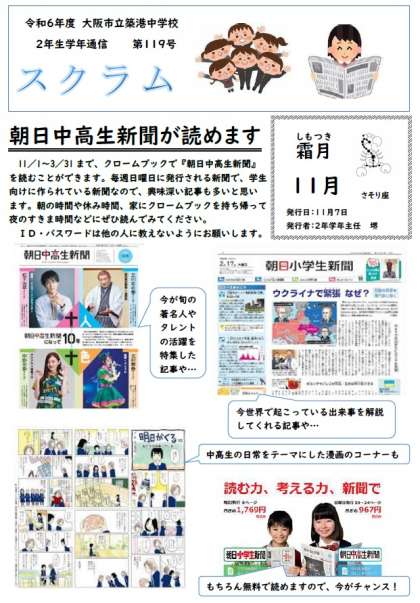 2年生学年通信スクラム第119号は、朝日中高生新聞デジタル版のお知らせです。