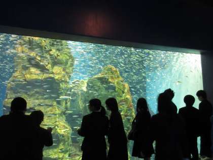 解剖実習後、楽しみにしていた館内見学へ。カタクチイワシの餌をとらえる様子を観察するため、水槽の上から餌を与える班とガラスの面から観察する班に分かれました。水槽の上から餌を与えたとき、カタクチイワシの動きがとても速くなり子どもたちは大興奮。ガラス面から観察するときもカタクチイワシの泳ぎ方や餌をとらえる様子をしっかり観察していました。