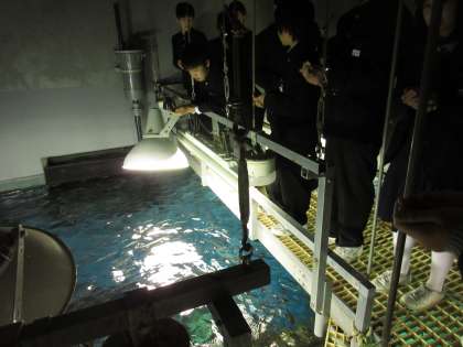 最後は最上部(8F)にある給餌場へ行きました。飼育員が着ているドライスーツの説明や掃除器具、医療器具の説明を受けました。1年生には海遊館の仕事に興味がある生徒もおり、真剣に話を聞いていました。