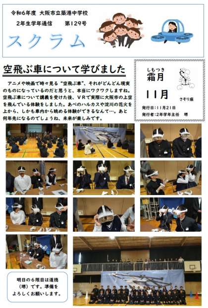 2年生学年通信スクラム第129号は万博プロジェクト(空飛ぶ車)です。