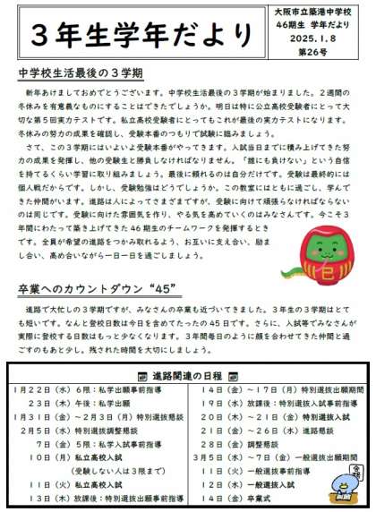 3年生学年だより第26号は、いよいよ卒業に向けて、また進路選択の時期となっています。