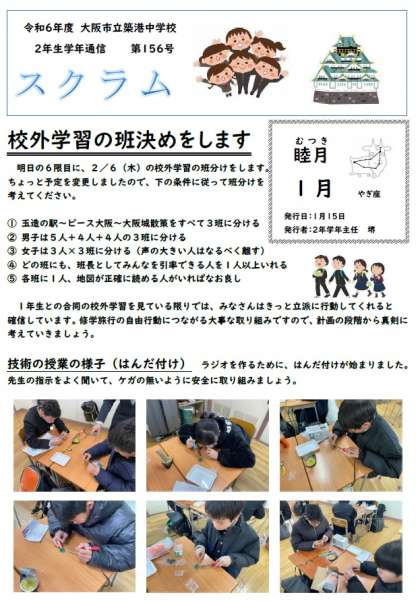 2年生学年通信スクラム第156号は校外学習の班決めと、技術の授業のようすです。