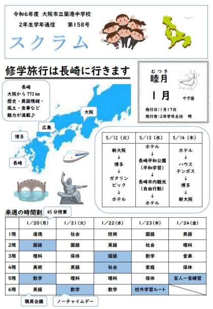 2年生学年通信スクラム第158号は、修学旅行先とその行程です。