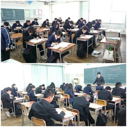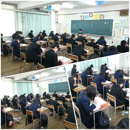 1年生3教科、2年生5教科です。昨日もお知らせしたように大阪市内だけでなく大阪府内の中学生が一斉に受験しています。今回から結果が公立高校の選抜の資料として活用されるということで、これまで以上に真剣なまなざしでテストに臨んでいました。日々の勉強の成果があらわれることを期待しています。