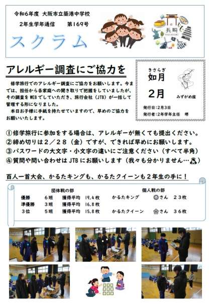 2年生学年通信スクラム第169号は、百人一首大会の結果です。