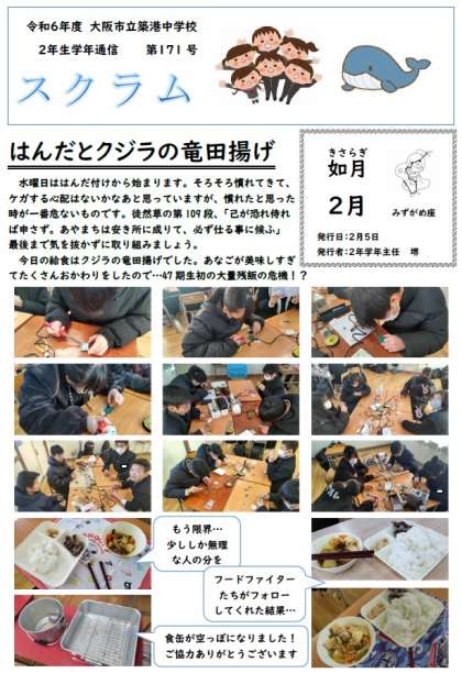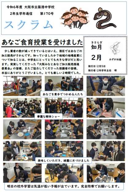 2年生学年通信スクラム第170号と、2年生学年通信スクラム第171号は、地域の特産品である あなご を知る授業と、技術の時間のようすです。