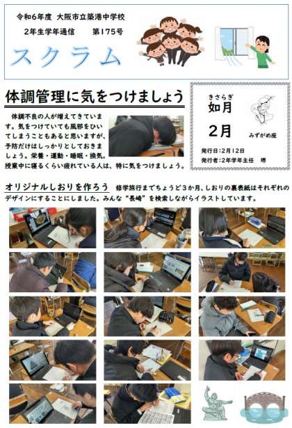 2年生学年通信スクラム第175号は、修学旅行に向けて、しおりの裏表紙のデザインをしています。自分で調べた長崎の表現を楽しんでくださいね。