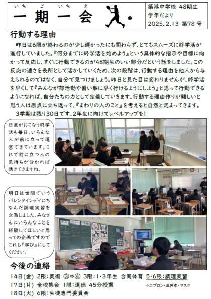 1年生学年通信一期一会第78号は、行動する理由についてです。