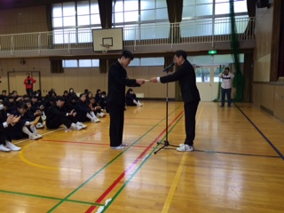同じく、1月18日(月)の全校集会で、15日(金)に行われたスケート教室の修了証が校長先生から代表の3年生に授与されました。修了証には、最終日に認定テストをして頂いたA〜C級の判定結果も記載されています。