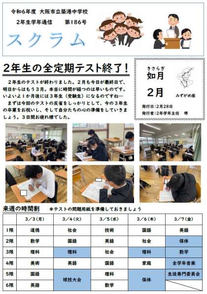 2年生学年通信スクラム第186号です。学年末テストが終わりました。