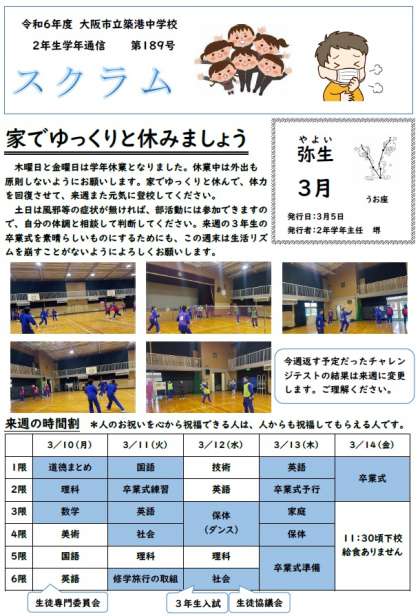 2年生学年通信スクラム第189号です。木・金と1・2年は休業となりましたため、時間割が変更になります。