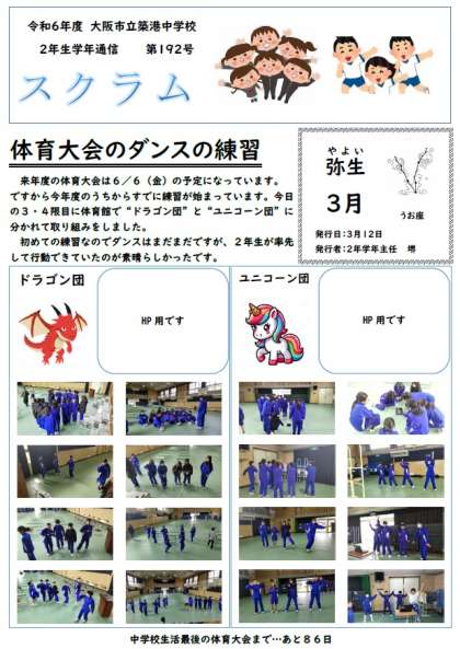 2年生学年通信スクラム第192号は、6月6日予定の体育大会の練習です。
