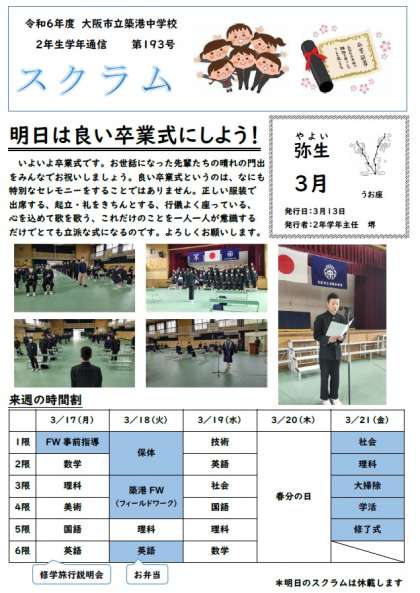 2年生学年通信スクラム第193号は卒業式予行です。