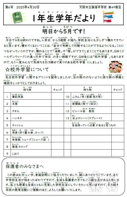 1学年だより第6号です。5月に入りました。