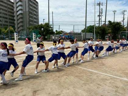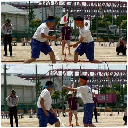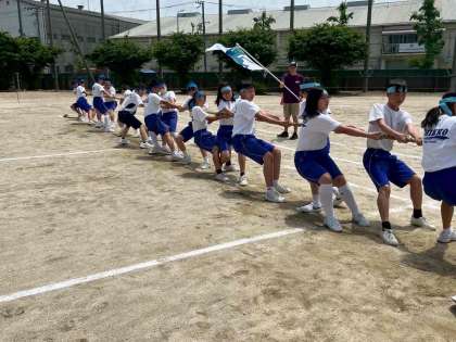 綱引きの様子です。どちらの団も力を合わせて綱を引きます。
