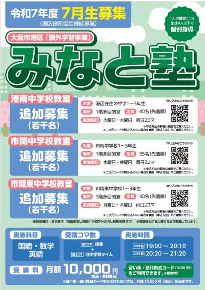 【みなと塾】令和7年7月生再募集チラシ(大阪市港区「課外学習事業」)