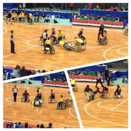 第3ピリオドで逆転され、34対39で日本が厳しい状況です。激しい当たりで、車椅子が転倒しています。頑張れ!ニッポン。