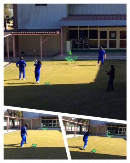ゴルフ上級者の校長先生のご指導のもと、体験した3年女子は「めっちゃ楽しい〜」と大喜び!授業時間が終わるのを名残惜しそうにしていました。