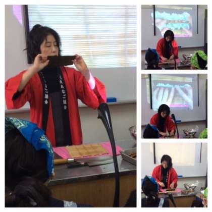 3限目は、2年1組の授業です。あなご組合の皆さんが、あなごをさばき、串をさすところを実演して見せてくださいました。あまりの手際よさに、ビックリ!ヒレを切る時に出る音は、まるでファスナーを開け閉めしているようでした。あなごの押し寿司、巻き寿司の作り方も教えていただきました。職人さんが使う包丁なども、家のとは違って興味深い物でした。