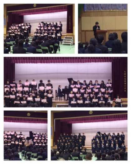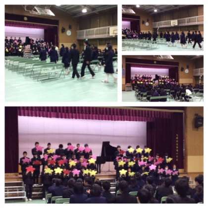 月曜日の6限目、生徒会主催による『3年生のお別れ集会』を行いました。卒業式はまだ少し先ですが、後輩たちから先輩へ、今までお世話になった感謝を伝えようという集会です。3年生を拍手で出迎えた後、1・2年生の合唱を聴いていただきました。1年生はGreeeenの『遥か』で、ピアノ演奏は長峰先生です。2年生はゆずの『また会える日まで』で、ピアノ演奏は2組の白鞘さんです。どちらも練習の時より大きな声で歌うことができました。「1・2年生の合唱を聴いて泣いてしまった」という先輩もいたそうです。練習してきてよかったですね。