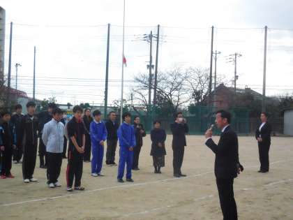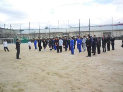 東日本大震災から5年が経った3月11日(金)、卒業式を終えて部活動をしている1,2年生がグランドに集合し、午後2時46分に追悼式を伝えるラジオ放送に合わせて1分間の黙祷を行いました。