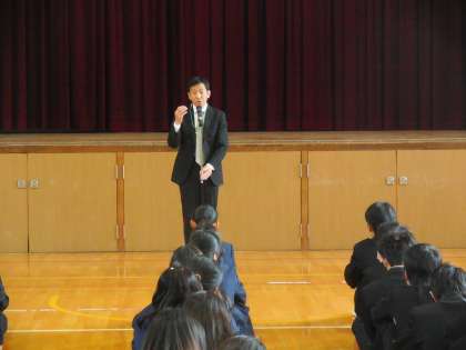 校長先生からのお話。昨日大阪も桜の開花宣言がありいよいよ春本番を迎えます。学校は年度で1年を考えるので平成27年度が終了するわけですが、今年1月に話をした今年の目標は、生徒会新聞の最終号でも取り上げてくれたように「ハッピー大作戦」です。「ハッピー指数」を上げて新年度を迎えましょう。服装で先生方から注意を受けて「ハッピー指数」が下がっている人がいます。一人一人が築港中学校の看板を背負っているという意識をしっかり持って行動してください。年度変わりは、変われるチャンスです。先生方も変わります。ぜひとも、自分の良さを引き出す変化を、「ハッピー指数」が上がる変化を新学期に向けて期待しています。みんなで盛り上げましょう・・・・というような内容で熱く語られました。